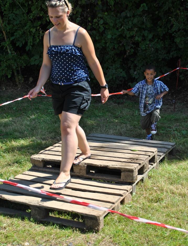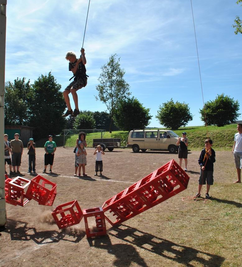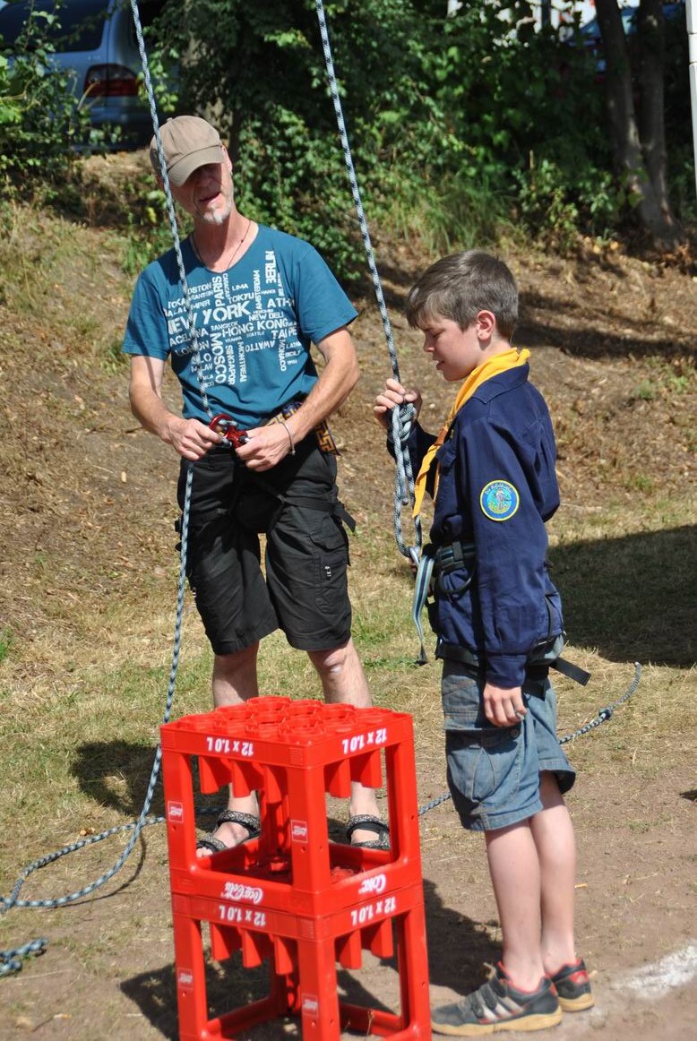 Ganz wagemutige konnten sich, mit der AWO Sommerberg, beim Kistenstapeln in große Höhen vor arbeiten. Gesichert mit Kletterseil galt es 15 Getränkekisten oder mehr übereinander zu stapeln und gleichzeitig auf dem schmalen Turm auch noch mit in die Höhe zu klettern.