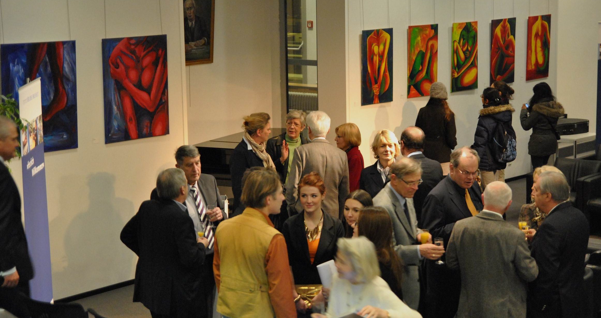Während sich die Teilnehmerliste wie das „Who is Who“ der Oberbergischen Politiker und anderer Prominenz liest, unter anderem: Ina Albowitz, Michaela Engelmeier-Heite, Wiehls Bürgermeister Becker Bloningen, der FDP Bundestagsabgeordnete Jörg von Polheim und der „erste Diener“ der Stadt Gummersbach Frank Helmenstein, waren es an diesem Abend 2 junge Künstlerinnen, Annika Garling und Polina Snopkov und der Kabarettist Manfred Richter, die für das Rahmenprogramm sorgten. Eine Stunde vor dem Empfang eröffnete die Austellung zweier junger Abiturientinnen des städtischen Gymnasiums. Unter dem Titel „Der menschliche Körper“ zeigte Fr. Snopkov Bilder, die sie mit einem eigenen Modell ( war auch an den Abend anwesend!) auf die Leinwand brachte. Über die eigenen Bilder schreibt sie; „Aus Wissenschaft wurde Fantasie, welche meine Eindrücke des menschliche Körpers widerspiegelt. Erst die Farbe in ihrer kontrastreichen Vielfalt modelliert den Körper ausdruckstark!“