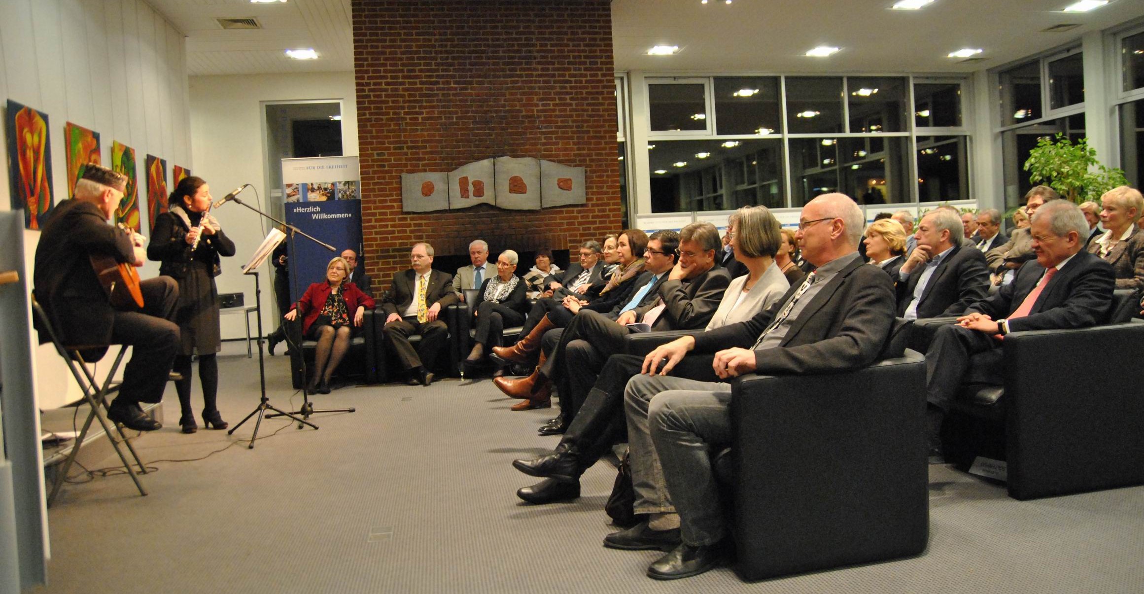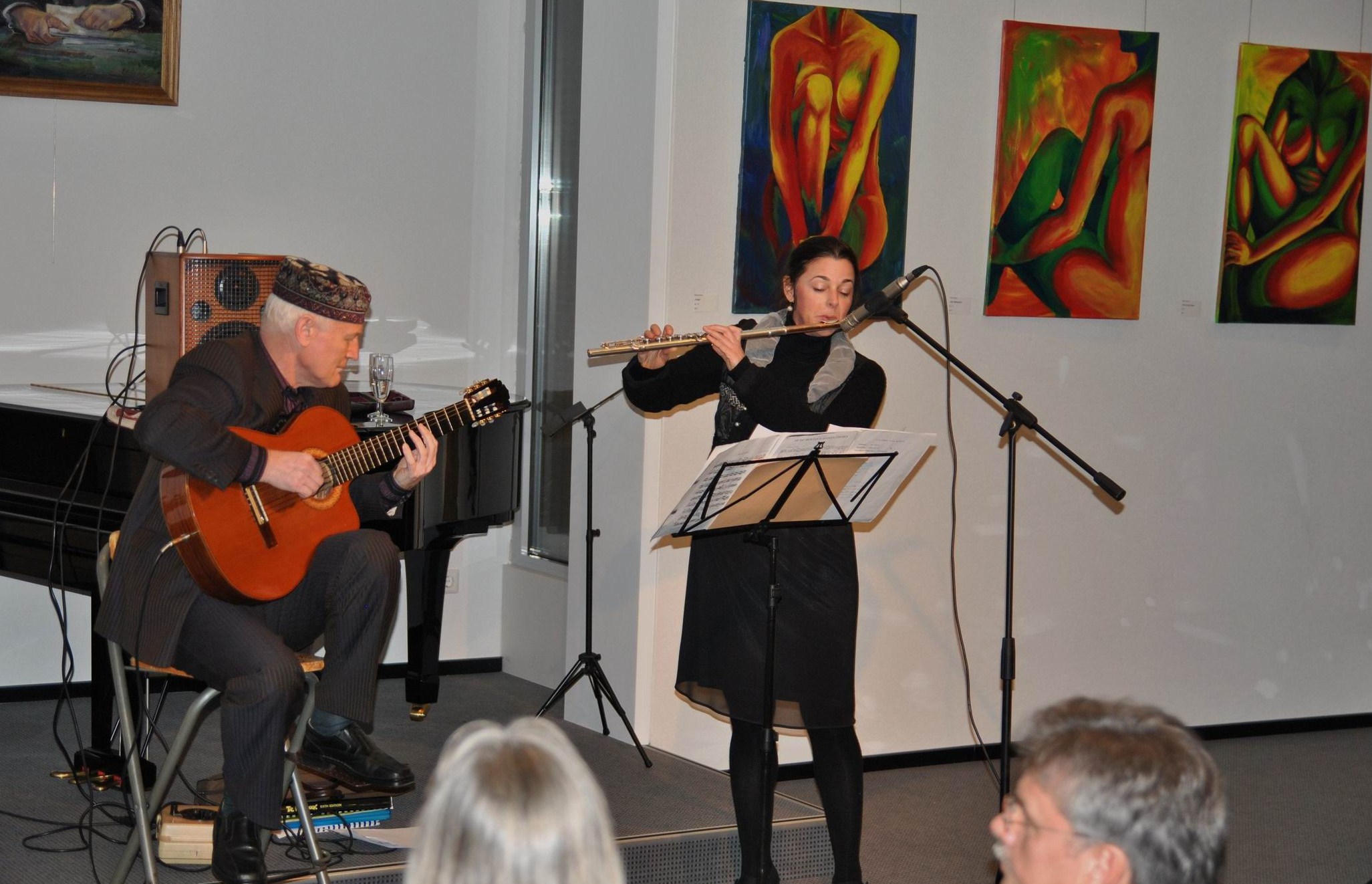 Nach einer kurzen Ansprache von Axel Hoffmann, stellvertretender Vorsitzender der Friedrich-Naumann-Stiftung, unterhielt das Duo Acuarela, mit Edveny Zhidkkov an der Gitarre und Katrin Heller an der Querflöte, mit südamerikanischen Rhytmen.