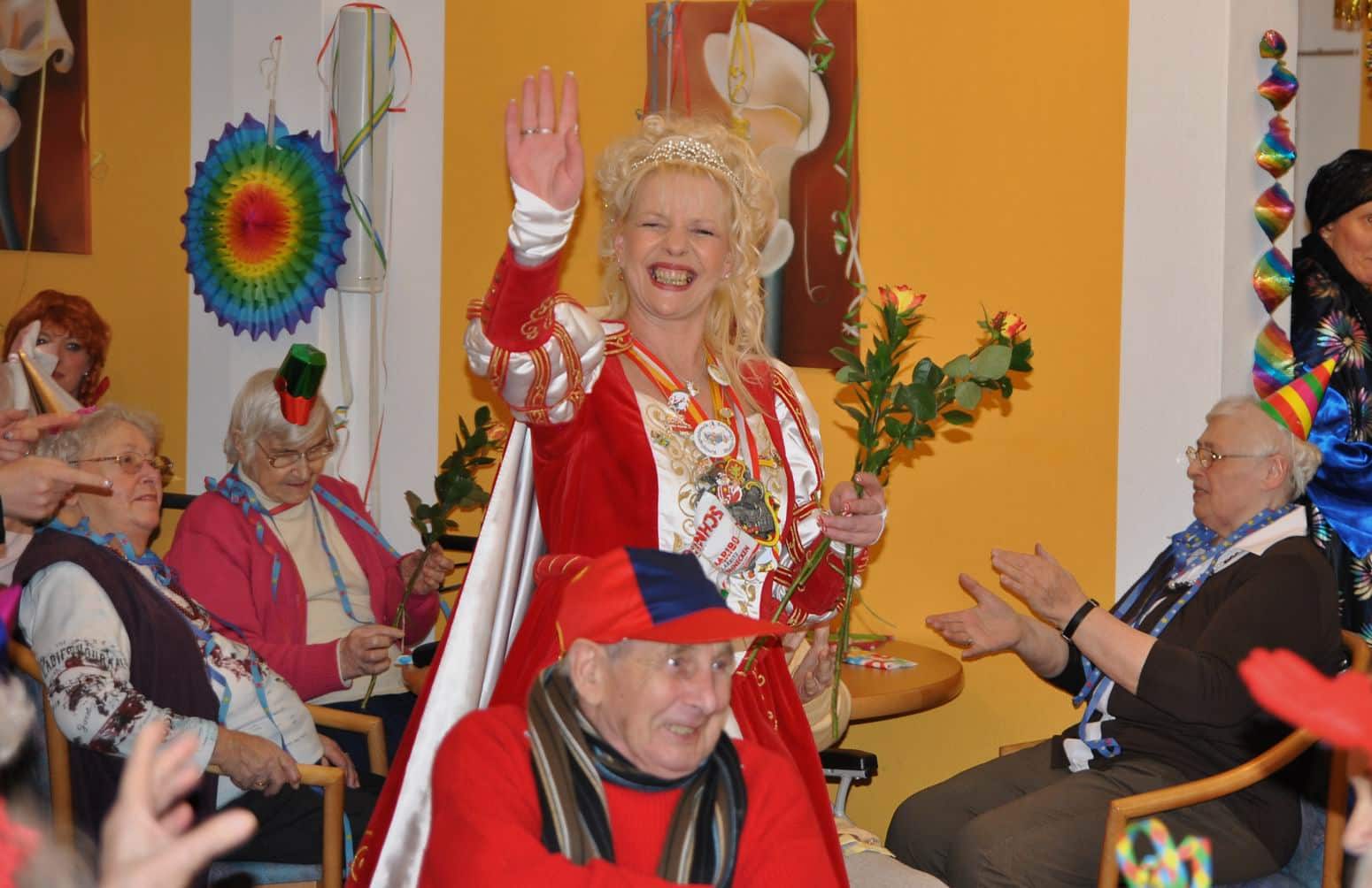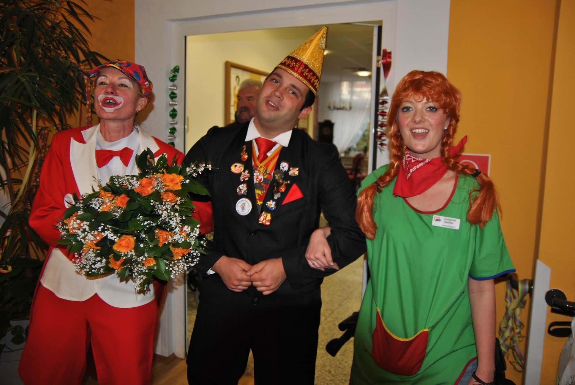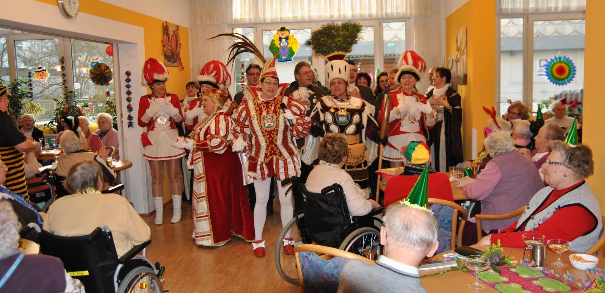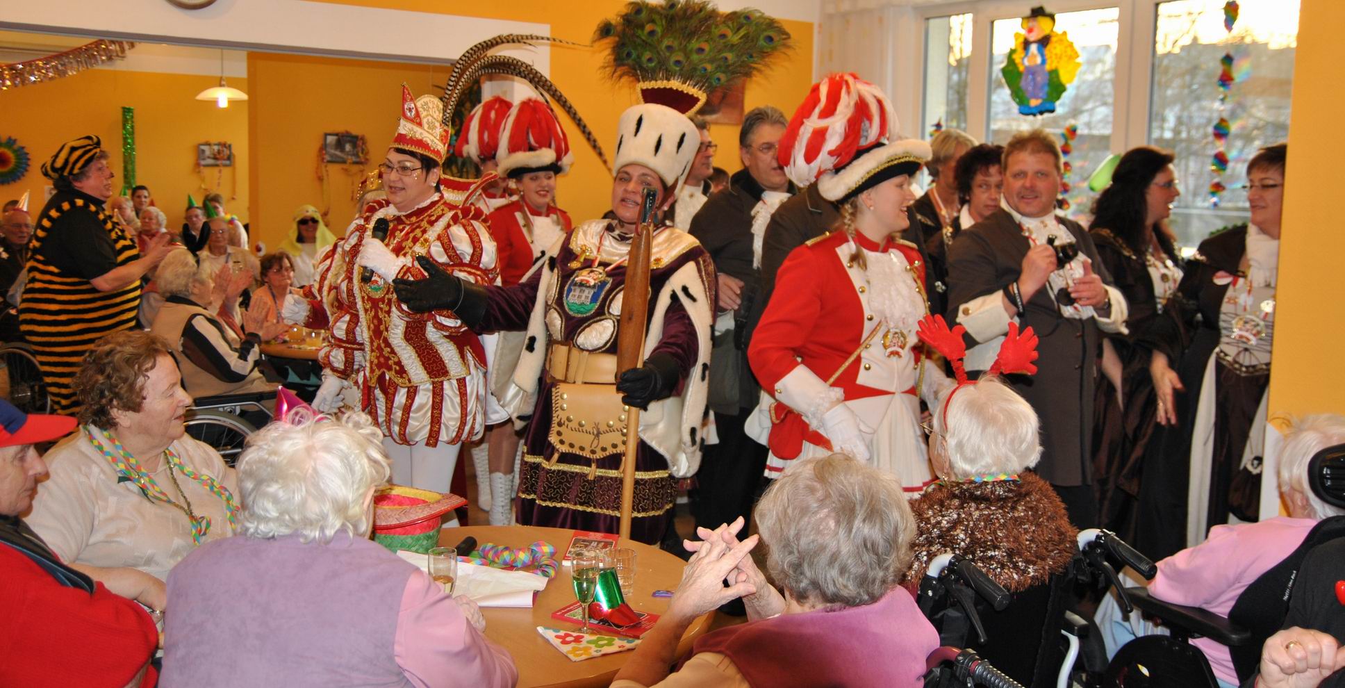 Das Programm wurde u.a. traditionsgemäß von den Karnevalsvereinen RKV 1975 e.V. Ründeroth, mit Prinz Frank II. und Prinzessin Angelika, sowie der KG Rot Weiß Denklingen, mit dem ersten weiblichen Dreigestirn des Vereins, Prinz Anne I., Jungfrau Moni und Bauer Ela, gestaltet, die es sich trotz eisglatten Straßen nicht von ihren Besuchen abschrecken ließen. Beide Vereine zogen mit Ihren Tollitäten sowie ihrem Hofstaat ins Seniorenheim ein, nur die Kindertanzgruppe der Denklinger Karnevalisten, musste dem Wetter Tribut zollen und blieb leider zu Hause. Mit ihren farbenprächtigen Kostümen, guter Laune und schwungvoller Musik versetzten sie die Bewohner in Karnevalshochstimmung und luden zum Mitsingen und Schunkeln ein.