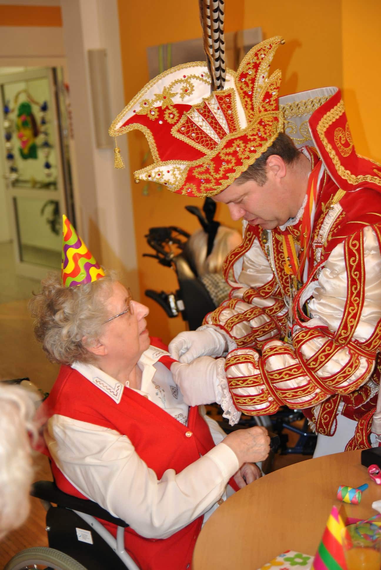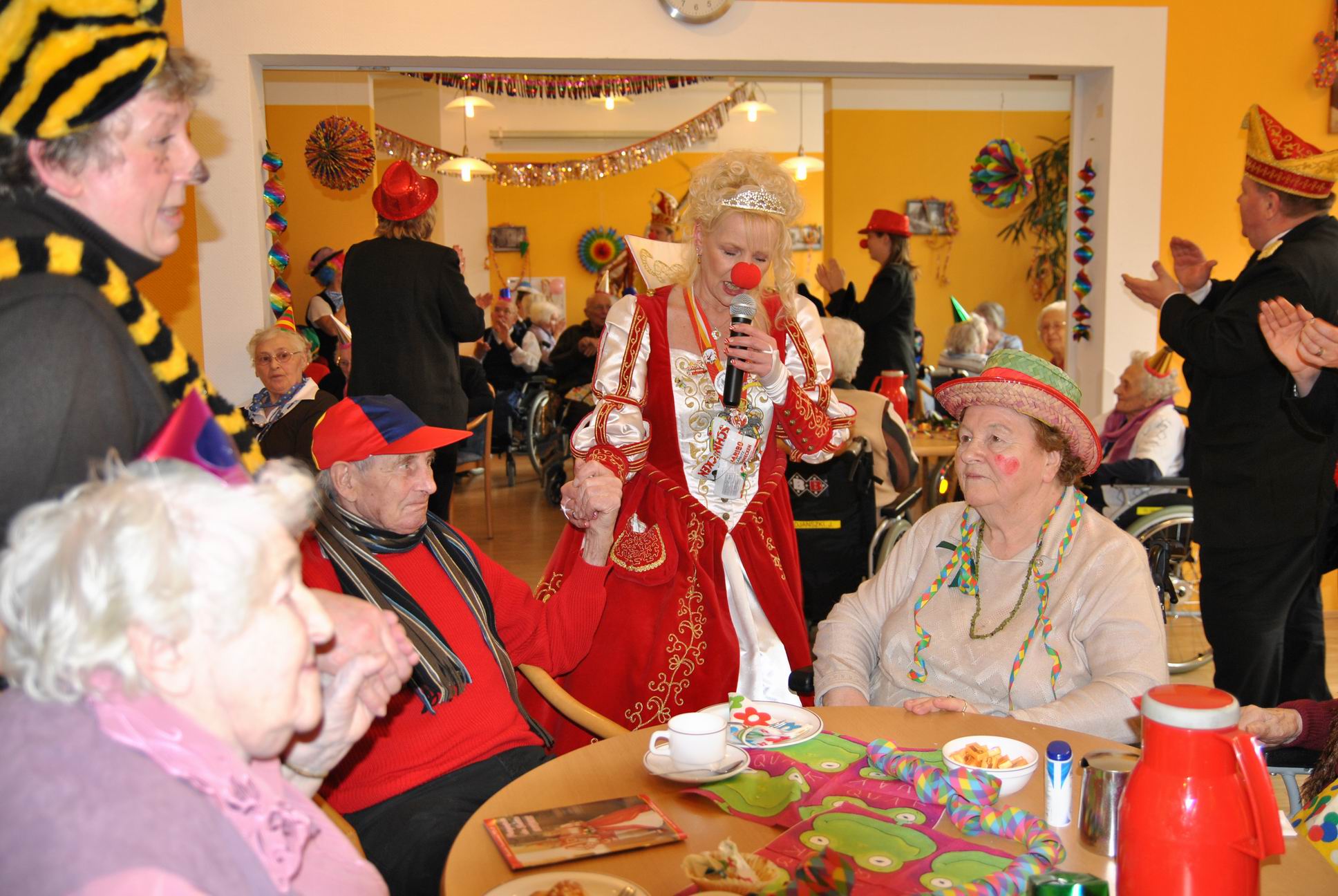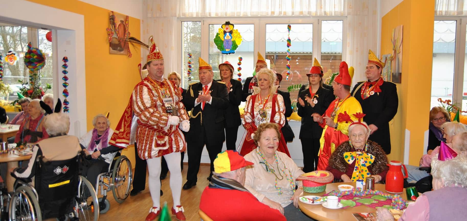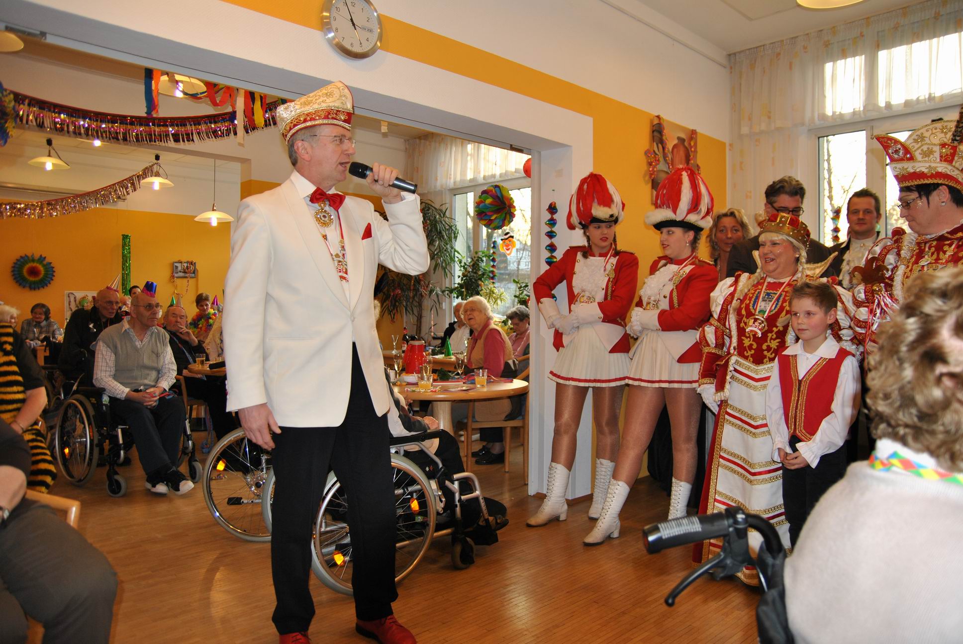 Das Programm wurde u.a. traditionsgemäß von den Karnevalsvereinen RKV 1975 e.V. Ründeroth, mit Prinz Frank II. und Prinzessin Angelika, sowie der KG Rot Weiß Denklingen, mit dem ersten weiblichen Dreigestirn des Vereins, Prinz Anne I., Jungfrau Moni und Bauer Ela, gestaltet, die es sich trotz eisglatten Straßen nicht von ihren Besuchen abschrecken ließen. Beide Vereine zogen mit Ihren Tollitäten sowie ihrem Hofstaat ins Seniorenheim ein, nur die Kindertanzgruppe der Denklinger Karnevalisten, musste dem Wetter Tribut zollen und blieb leider zu Hause. Mit ihren farbenprächtigen Kostümen, guter Laune und schwungvoller Musik versetzten sie die Bewohner in Karnevalshochstimmung und luden zum Mitsingen und Schunkeln ein.