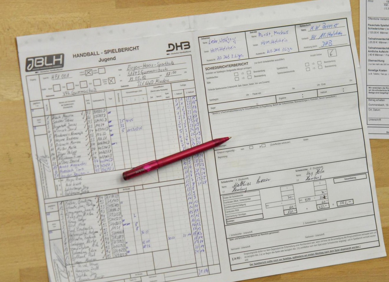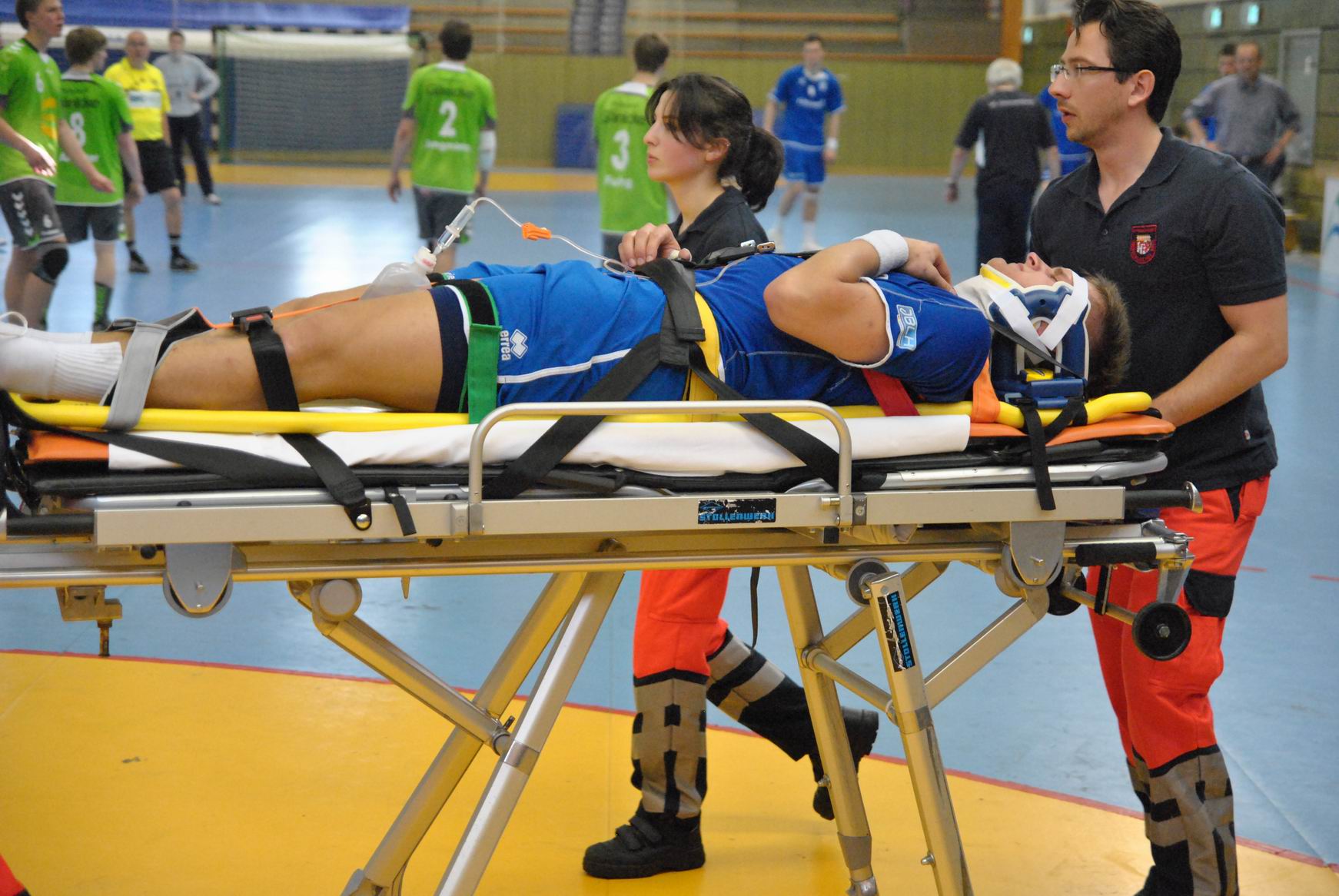 Ungeachtet davon ließen die beiden Bundesligaschiedsrichter Brauer und Holm ( die das Spiel bis dahin gut geführt hatten!) das Spiel einfach weiter laufen, so das Minden Sekunden vor Spielschluss noch zum 32:34 Rückstand verkürzen konnte. Danach durfte erst die Betreuerin Julia Goldmann sich um Heyme kümmern. Dieser war zwar ansprechbar, aber scheinbar stark benommen und lag weiterhin mit schmerzverzerrtem Gesicht minutenlang auf dem Boden. Die Sanitäter in der Halle stützten daraufhin den Nacken von Heyme und ein Arzt aus dem Zuschauerraum legte einen venösen Zugang. Mit den herbei gerufenen Rettungswagen wurde Heyme dann vorsichtig auf eine Trage gelegt und vorsichtshalber ins Krankenhaus gefahren. Die bis dahin sehr gute Stimmung der ca. 400 Zuschauer war dahin und es herrschte entsetzte Ruhe.
