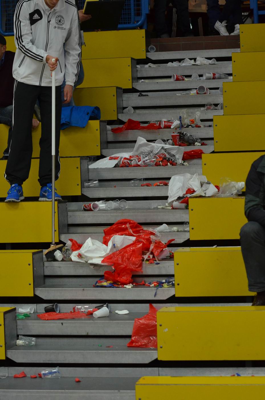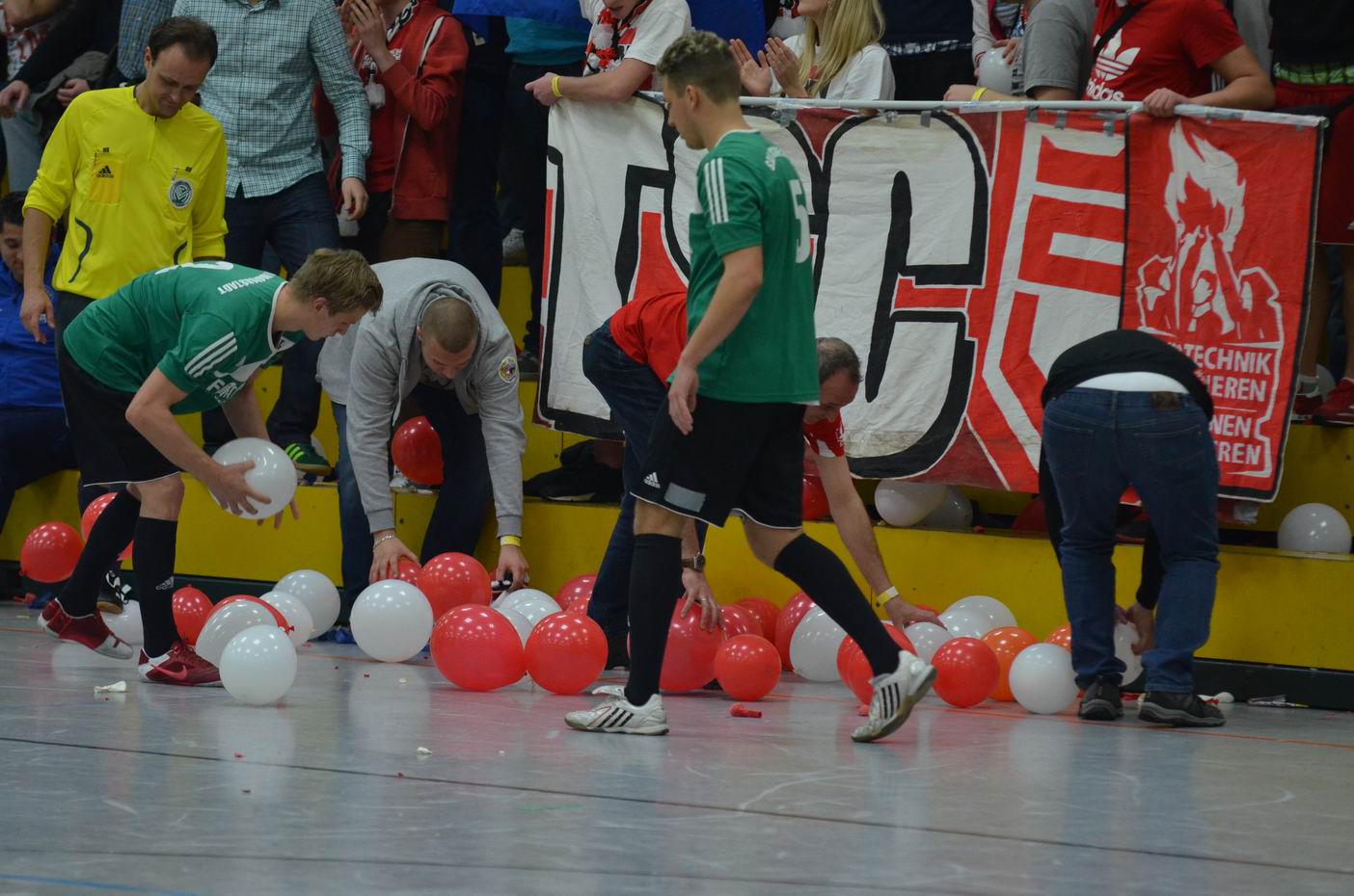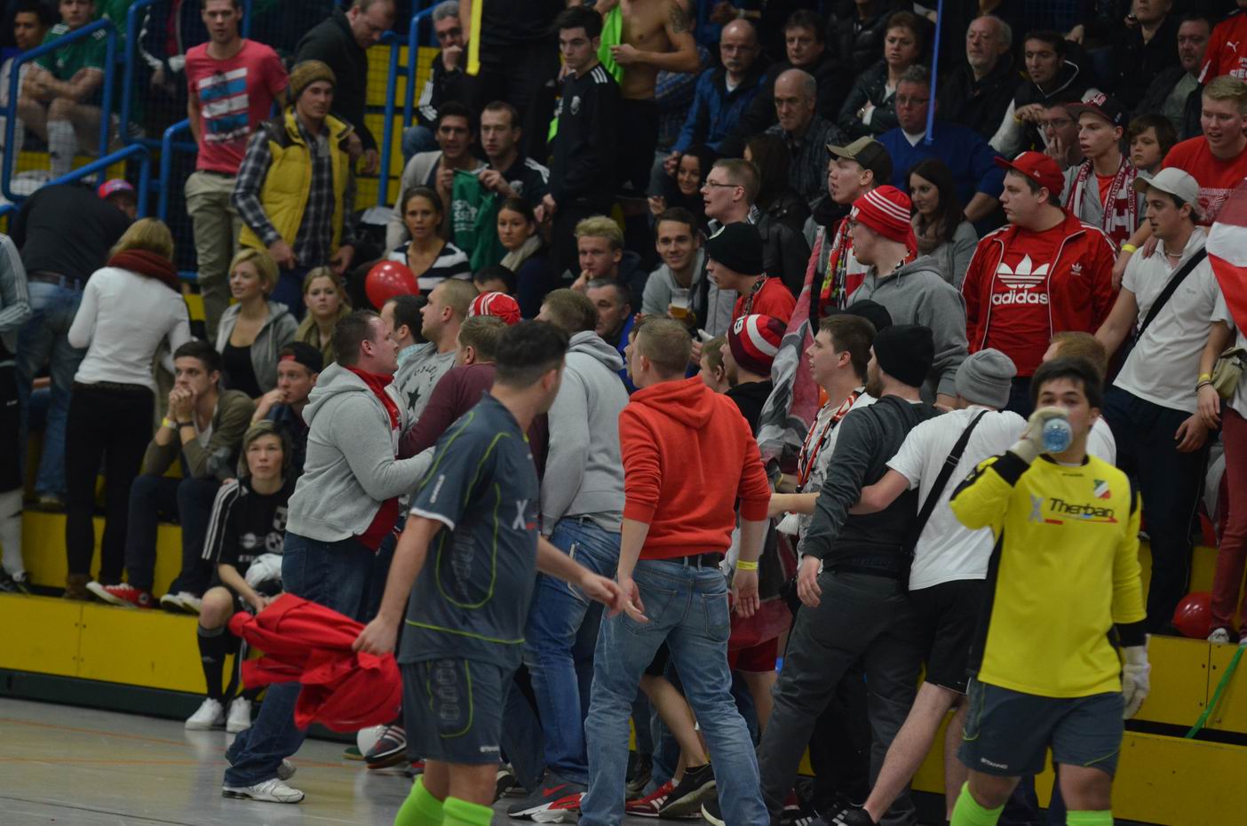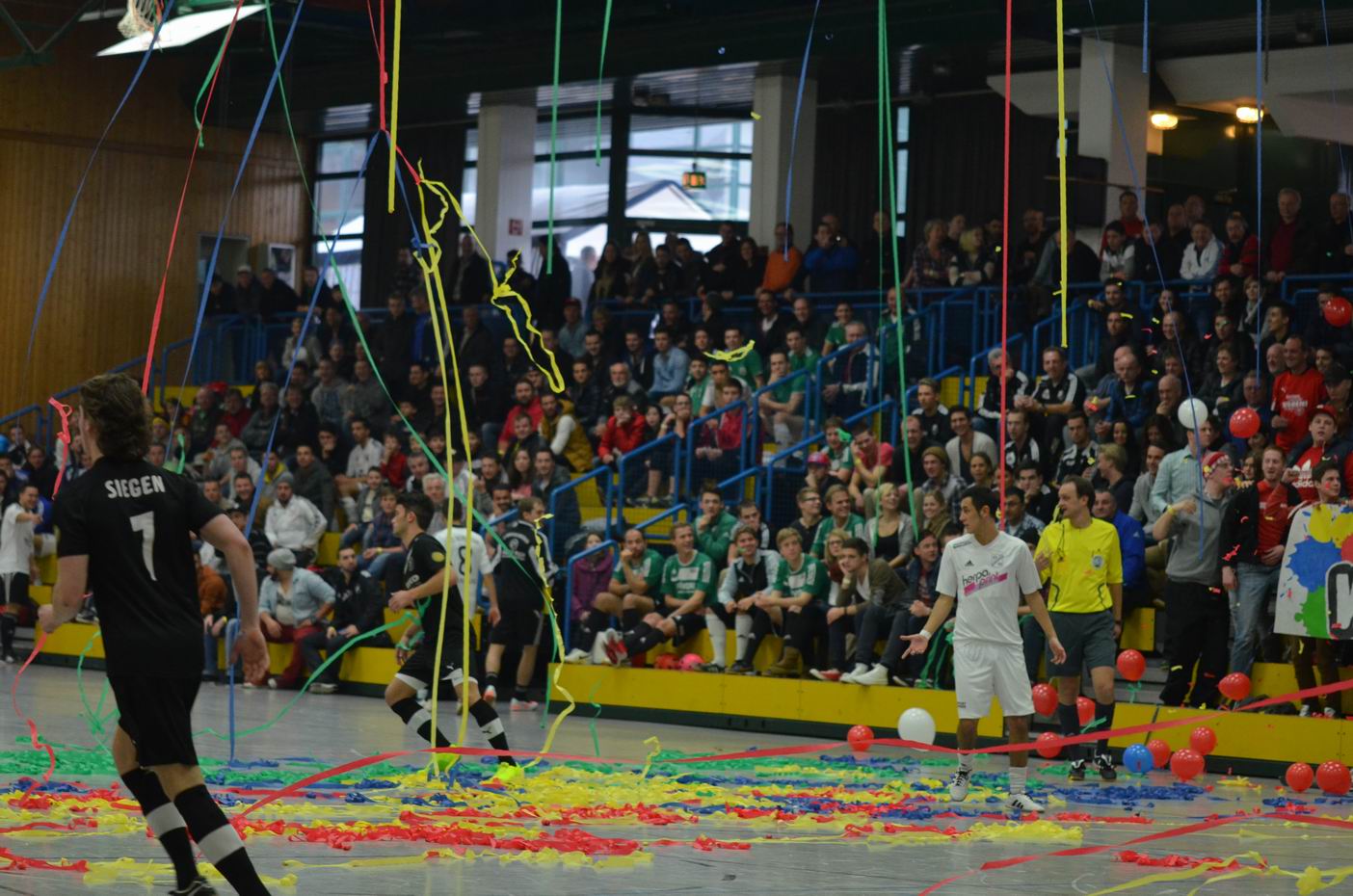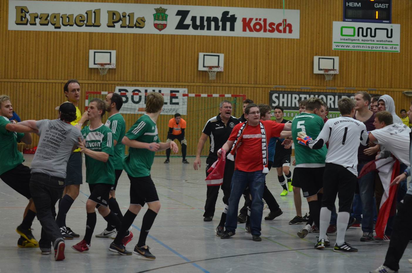 ….leider fielen diese Fans dann auch durch Ihre Unbeherrschtheit auf. Nicht nur, das Sie vor dem ersten Spiel ihrer Mannschaft ein „Inhousefeuerwerk“ zündeten, was dazu führte, dass die Mannschaften und die Fans erst mal das Spielfeld von Luftschlangen säubern musst. Es kam dann leider beim letzten Vorrundenspiel gegen den SSV Bergneustadt zu Handgreiflichkeiten. Etliche Fans liefen auf das Spielfeld, versuchten Spieler zu attackieren und pöbelten rum.