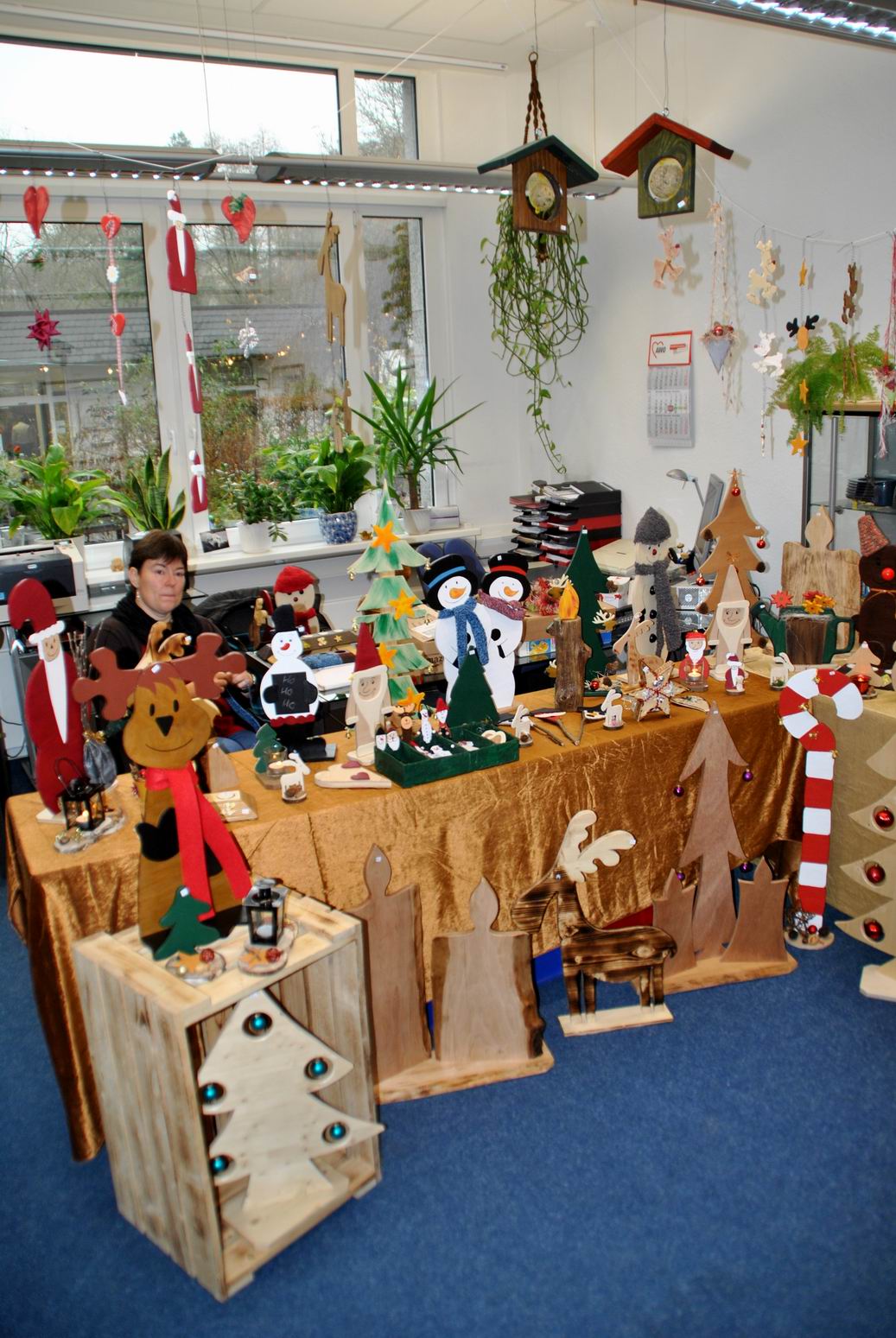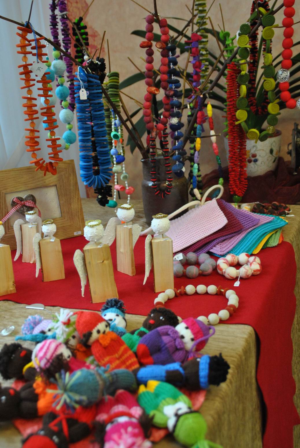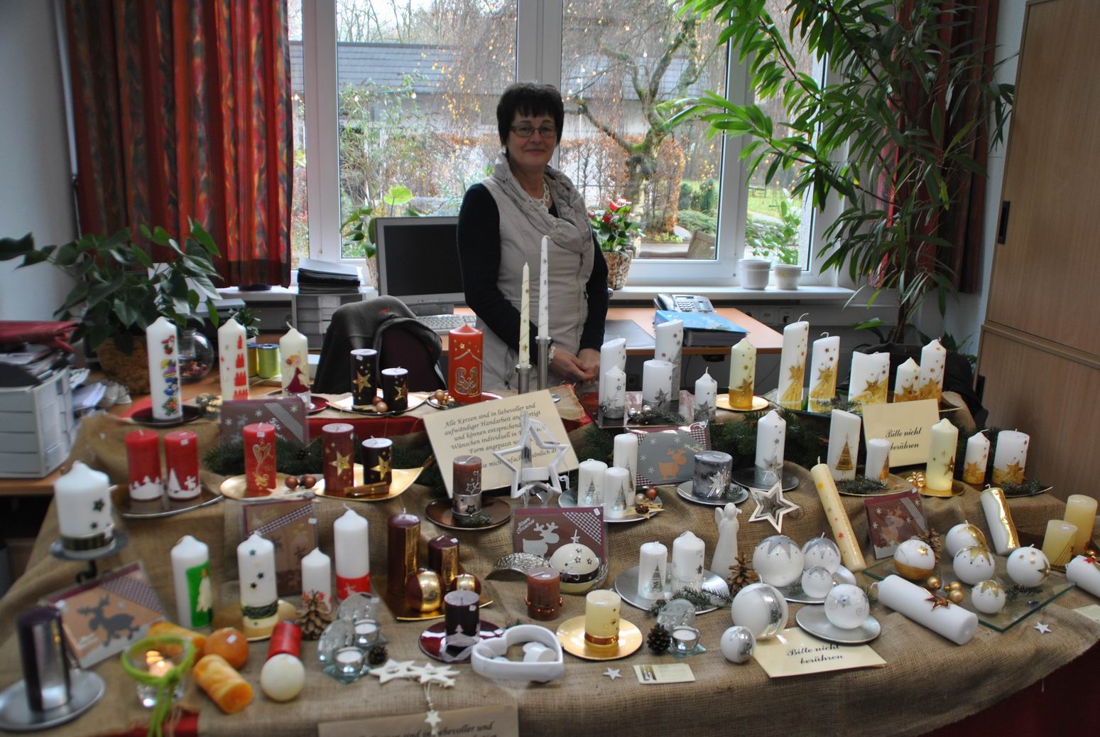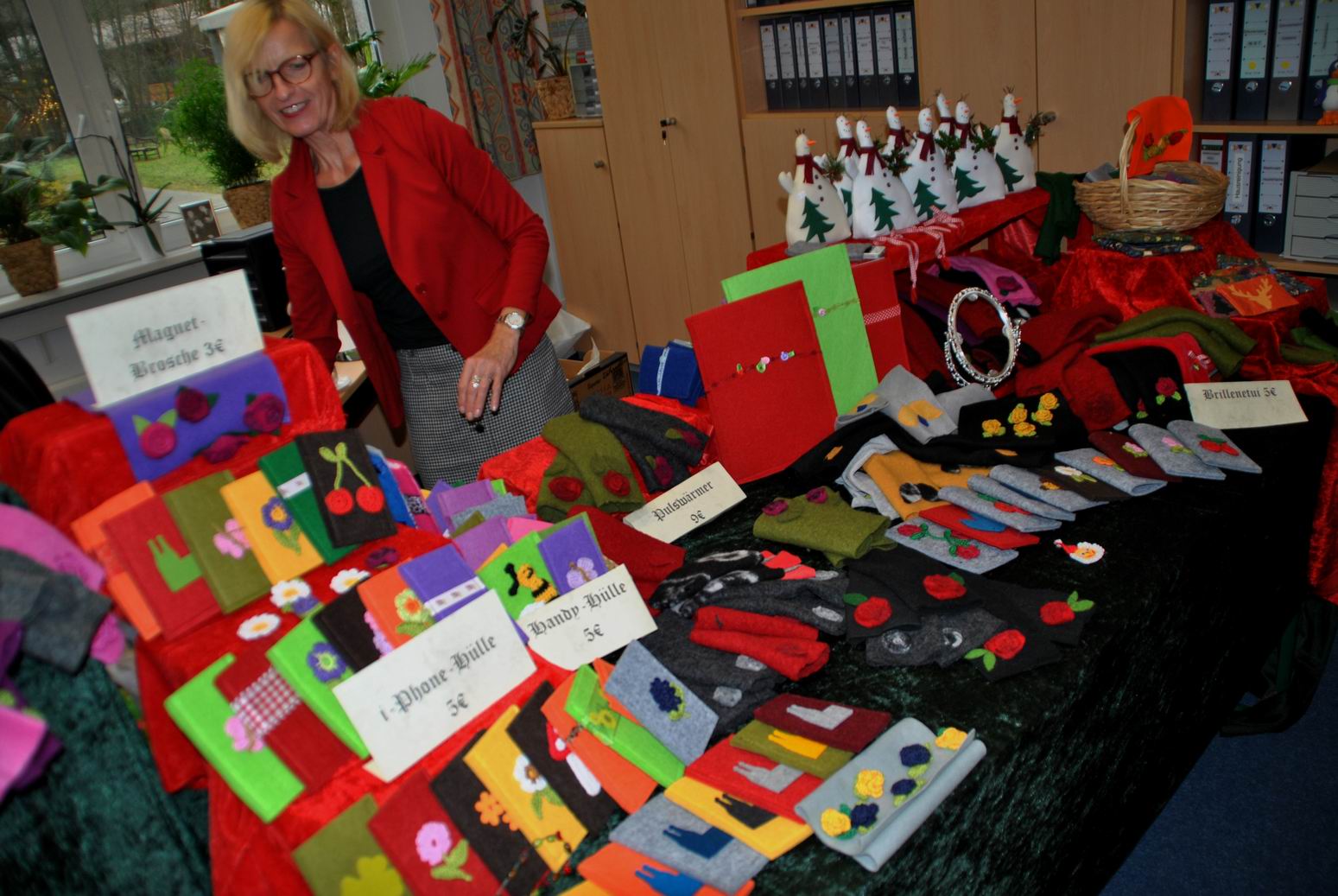 Es wurden z.B. Arbeiten aus Holz, Keramik, Stoff, Filz oder Papier neben Schmuck, Malerei und Handarbeiten ebenso angeboten wie Geschenkverpackungen, Kerzen und Gestecke.