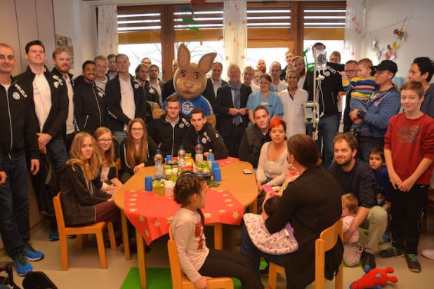 Unter dem Motto „Mitmachen – Freude schenken“ hatte der VfL Gummersbach seine Fans gebeten, für Kinder, die in der Weihnachtszeit im Krankenhaus liegen müssen, Weihnachtsgeschenke zu spendieren. Dem Aufruf folgten die Fans gerne und spendeten großzügig Spielzeug, das die Profihandballer bei ihrem Besuch auf der Kinderstation jedem Kind persönlich überreichten, Autogramme und viele Fotos mit den Handballern gab es obendrein. „Vielen Dank für den schon traditionellen Besuch des Teams in der Kinderklinik“, freute sich der Hauptgeschäftsführer des Klinikum Oberberg über ein proppenvolles Spielzimmer, in dem sich 17 Spieler, Trainer und Geschäftsführer Frank Flatten gemeinsam mit den kleinen Patienten und ihrer Eltern sowie mit den beiden Chefärzten Dr. Walter Schäfer und Dr. Salem El-Hamid, Kinderärzten und Kinderkrankenschwestern trafen.