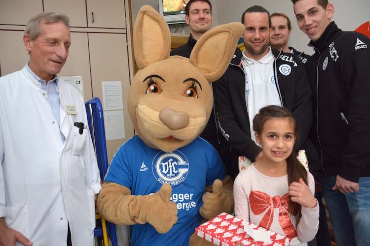 Unter dem Motto „Mitmachen – Freude schenken“ hatte der VfL Gummersbach seine Fans gebeten, für Kinder, die in der Weihnachtszeit im Krankenhaus liegen müssen, Weihnachtsgeschenke zu spendieren. Dem Aufruf folgten die Fans gerne und spendeten großzügig Spielzeug, das die Profihandballer bei ihrem Besuch auf der Kinderstation jedem Kind persönlich überreichten, Autogramme und viele Fotos mit den Handballern gab es obendrein. „Vielen Dank für den schon traditionellen Besuch des Teams in der Kinderklinik“, freute sich der Hauptgeschäftsführer des Klinikum Oberberg über ein proppenvolles Spielzimmer, in dem sich 17 Spieler, Trainer und Geschäftsführer Frank Flatten gemeinsam mit den kleinen Patienten und ihrer Eltern sowie mit den beiden Chefärzten Dr. Walter Schäfer und Dr. Salem El-Hamid, Kinderärzten und Kinderkrankenschwestern trafen.
