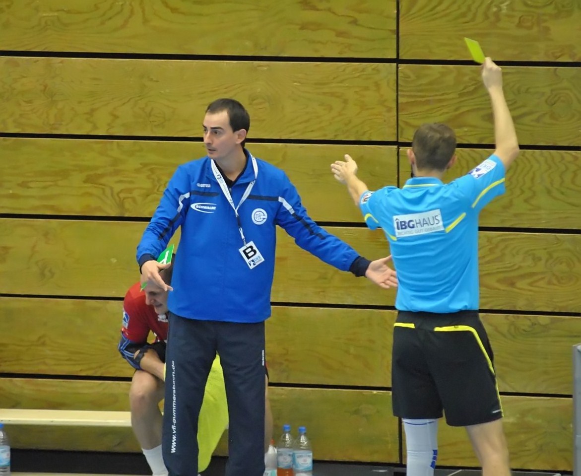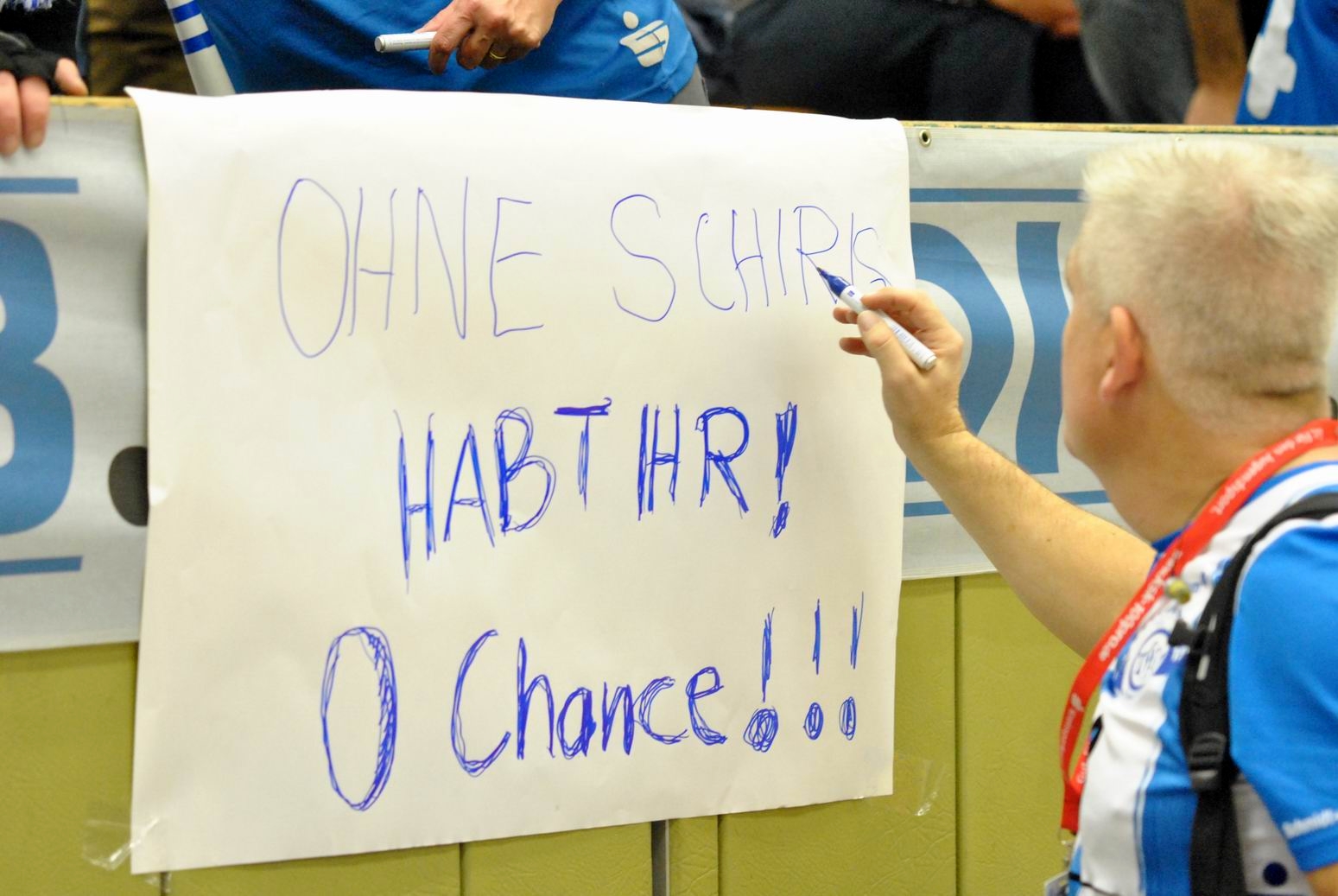 Nach der Pause wog das Spiel hin und her. Emir Kurtagic wurde aber durch die weiterhin ungerecht gegebenen Entscheidungen immer lauter am Spielfeldrand und forderte sogar die Offiziellen am Zeitnehmertisch auf, hier einzugreifen. Daraufhin sah er dann auch noch die gelbe Karte, was die Zuschauer endgültig zu lautstarken „Anti– Schiedsrichter“ Sprüchen ermutigte. Ein in der Pause schnell erstelltes „Ohne Schiris habt Ihr 0 Chance“ Plakat machte im Fanblock die Runde.