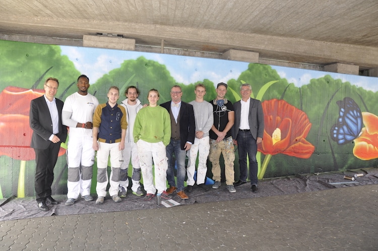 In der Innenstadt von Bergisch Gladbach ist eine naturbelassene Blumenwiese entstanden. Bei einem ersten flüchtigen Blick weiß der Betrachter nicht sofort, wie er die Fläche einsortieren soll. Echt ist die Landschaft nicht, aber es ist auch keine übergroße Fotografie. Nein! Hier haben fünf Auszubildende der Maler- und Lackiererinnung Bergisches Land ihr Können unter Beweis gestellt. In einem Graffiti-Workshop, angeleitet vom Graffiti-Künstler MR. Graffiti aus Duisburg (Mark Roberz), haben sie auf einer öffentlichen Fläche nahe der Innenstadt ein Stück unberührte Natur entstehen lassen. Ein Motiv, das zunächst einmal nicht im Einklang mit der Umgebung steht. Denn im Bereich der Stationsstraße herrschen vor allem der Verkehr und die Geschäftigkeit der Innenstadt vor.