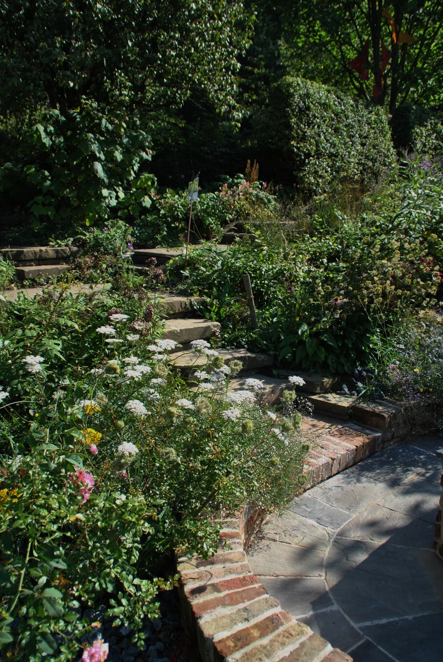 Ständig wechselnde Themengärten, immer neue Blickachsen, kleine verwinkelte Wege, verwunschene Ecken, gemütliche Sitzecken, und, und, und….