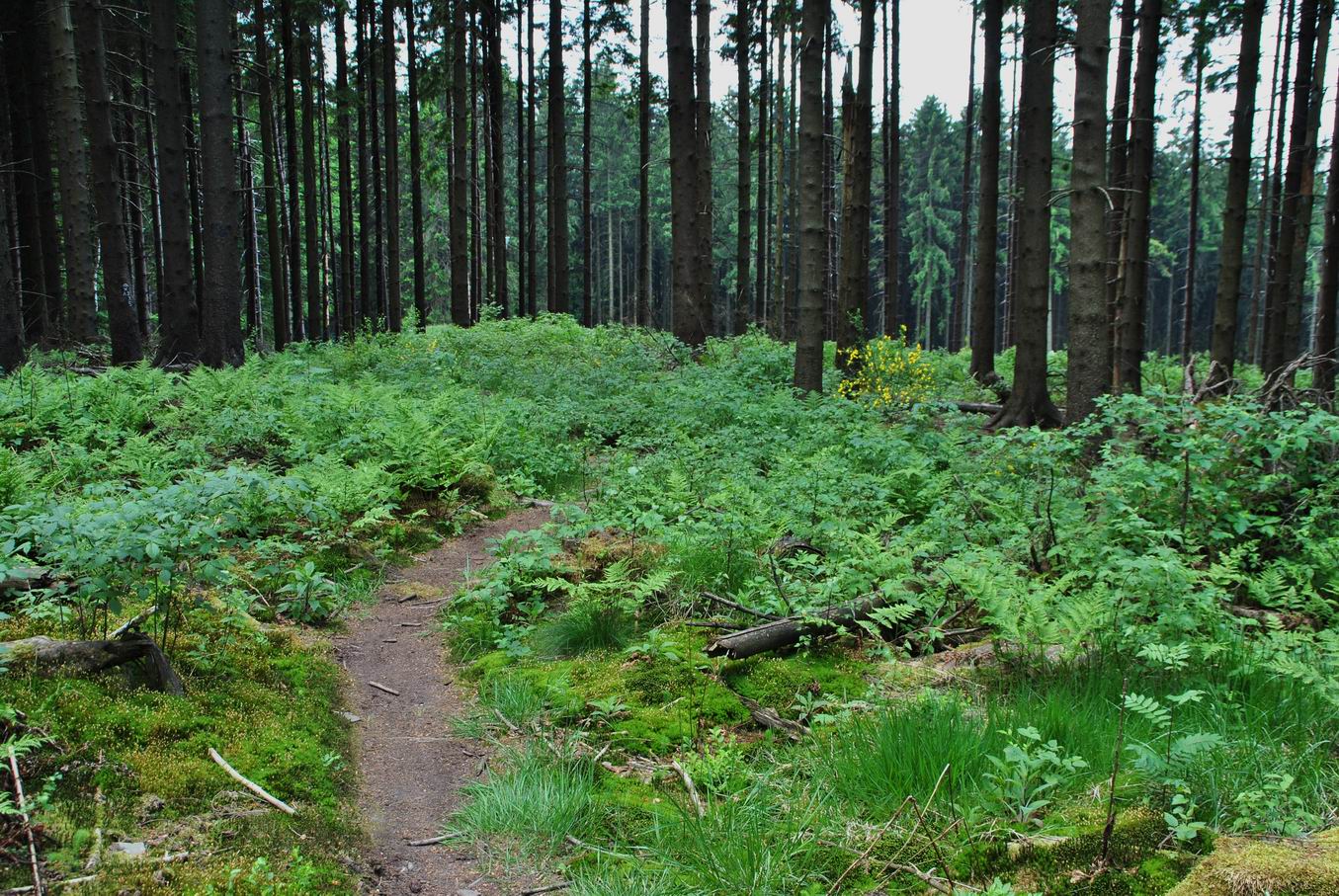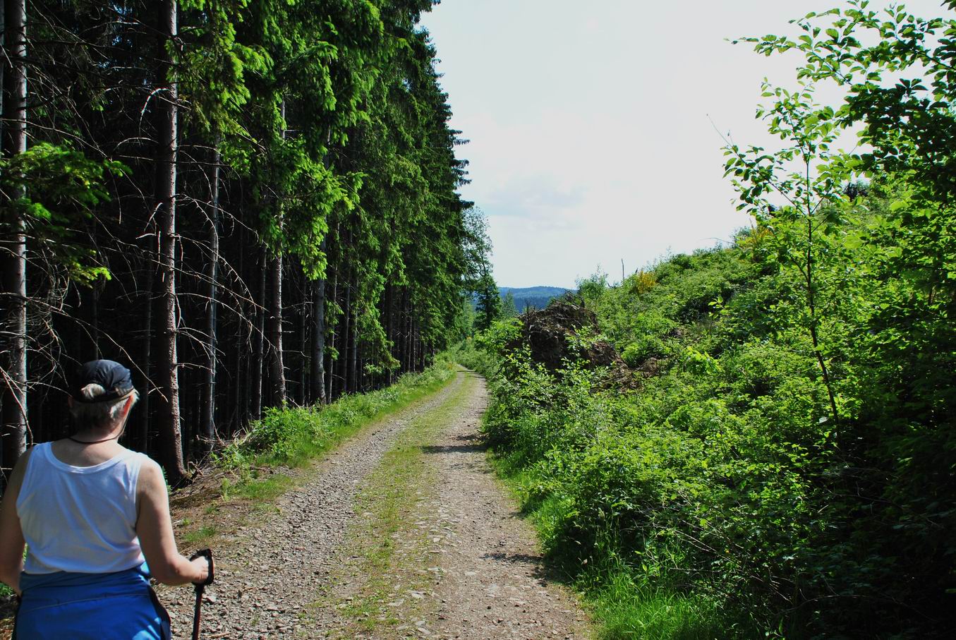 Wir gehen durch die Kirchstraße und biegen dann rechts in die Schützenstraße. Am Ende der Straße gehen wir einfach auf dem Waldweg weiter.