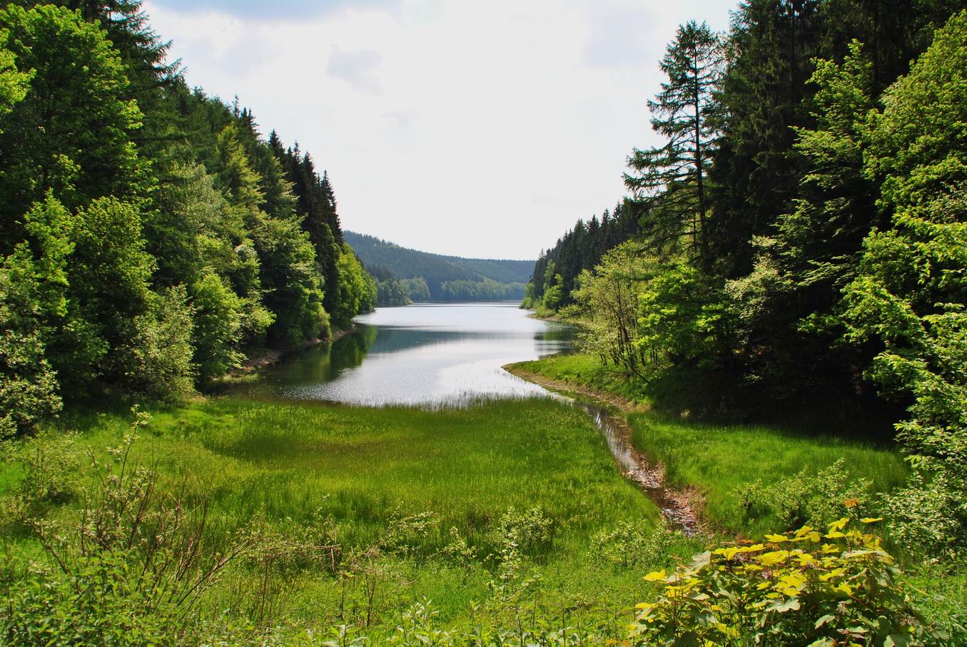 Auf dem mittlerweile geteerten Weg geht es dann weiter Bergab über den Parkplatz der Vorbeckens der Genkeltalsperre. Weiter rechts halten und auf dem Weg direkt an der Genkeltalsperre entlang weiter wandern.