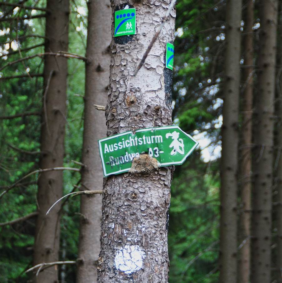 Nachdem wir einen „Fjord“ umrundet haben geht es an einem wanderschild scharf rechts den Berg hoch. Hier beginnt quasi schon der Aufstieg zum Unnenberg. Ganz oben auf dem Berg endet der Weg an einer Straße. Überqueren sie die Straße und laufen Sie links weiter. Ein paar Meter weiter geht die Straße dann rechts rauf auf den Unnenberg. Ab hier ist Ausdauer gefragt, denn die Straße zieht sich schön steil den Berg immer höher, bis man oben auf eine Freifläche trifft, auf der die Turmgaststätte ( leider geschlossen!), ein Kiosk und der Unnenbergturm steht. 505,7 m hoch sind gewandert. Zeit für eine Rast. Bänke und Tische stehen bereit und auch, wenn geschlossen, stehen die Toiletten der Gaststätte offen.