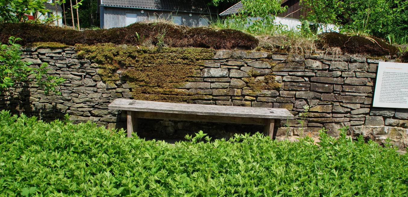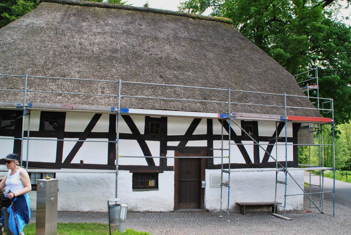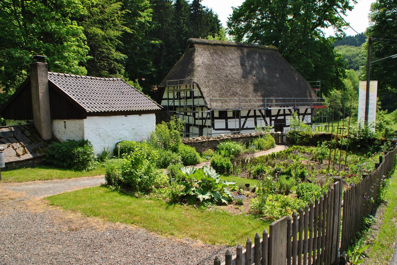 Ganz unterm im Tal, gehen wir über einen weiteren Wanderparkplatz hinweg und gehen gerade aus in Richtung Dahl. Hier führt der Weg zwar über eine Straße, die aber nur wenig befahren ist. Nach kurzer Zeit kommen wir nach dahl. Hier steht das älteste Bauernhaus des Oberbergischen, das „Haus Dahl“. 1586 erbaut. Zum Haus gehört ein Bauerngarten. Beides kann man besichtigen. Öffnungszeiten findet man im Internet.