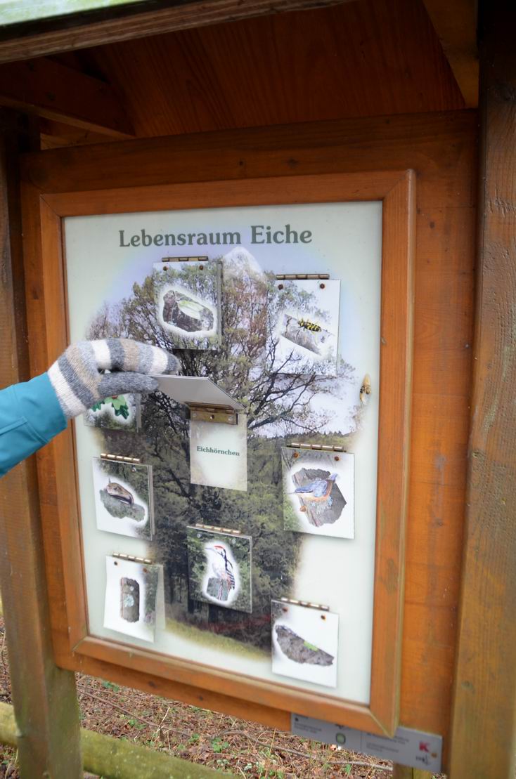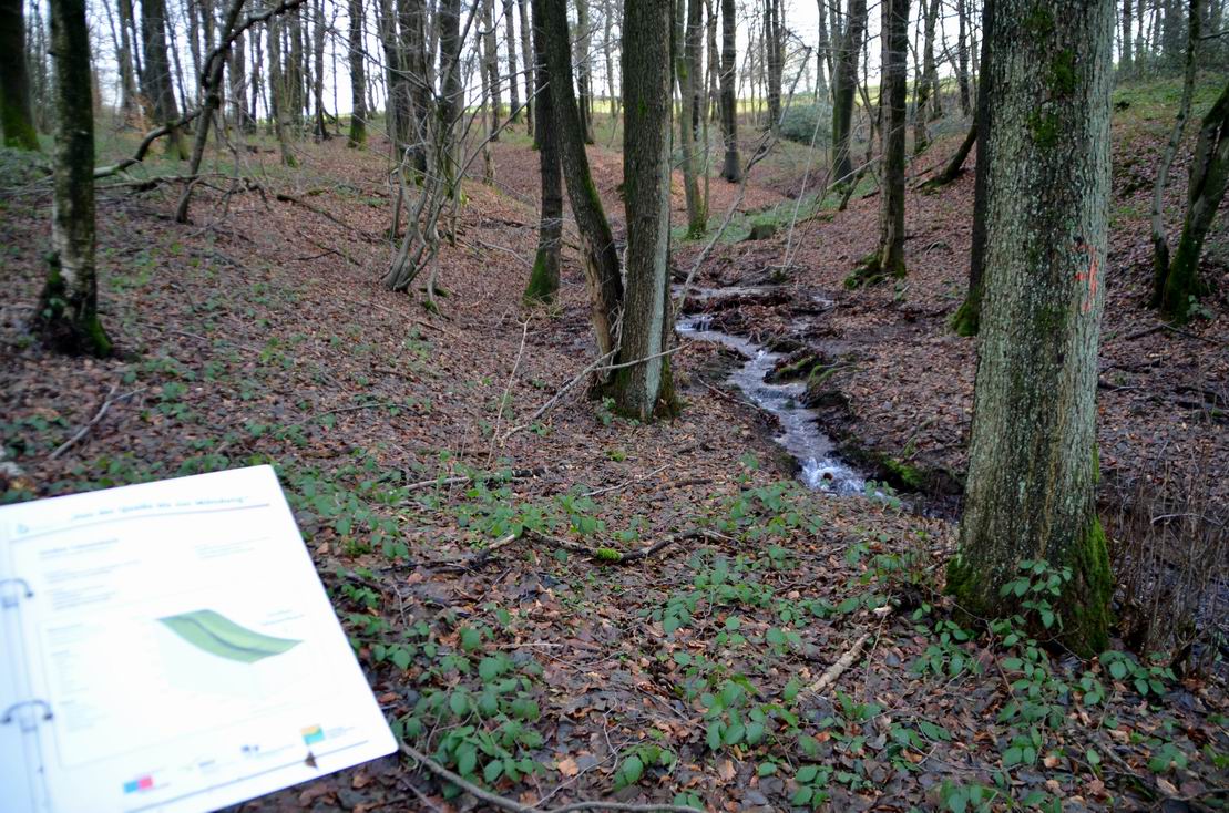 Im Wald steht der nächste Erlebnispunkt, hier wird die Entstehung eines Baches, von der Quelle bis zur Mündung erklärt.