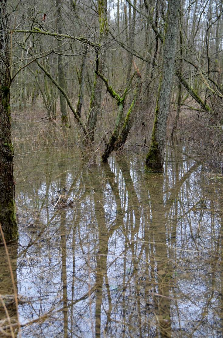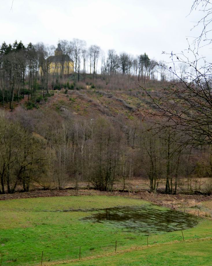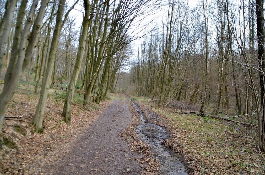 Hinter Huppichteroth laufen wir erst am Feldrand entlang und kommen dann in einen schönen Auenwald, der leider bei unserer Wanderung teilweise unter Wasser stand, so dass man sich ein kurzes Stück durch den Wald begeben musste.