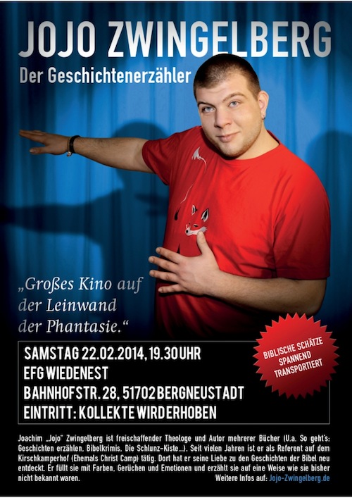 Bergneustadt - Der Geschichtenerzähler gastiert am Samstag, den 22.02.2014, im Gemeindehaus der Ev.-Freik. Gemeinde Wiedenest, in der Bahnhofstraße 28. Ab 19.30 Uhr verspricht Joachim Zwingelberg ein packendes Abendprogramm mit vielen…