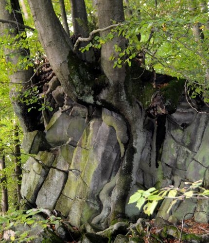 Ab hier führt ein kleiner Rundweg, nur ein paar Hundert Meter, zum Krater. Wenn Sie dann hier stehen, sollten sie kurz inne halten und überlegen, dass Sie gerade auf einem ehemaligen Vulkan stehen. Das Magma wurde hier an die Oberfläche gedrückt und beim Erkalten entstanden Spalten, die später dann durch Korrosion breite Risse entstehen ließen. Dadurch kommt es zu dem interessanten Aussehen der Basaltsäulen. Diese stehen eng aneinander in der Erde zusammen, durch die meist sechseckige Form sehen sie aus, als seien sie wie Bausteine zusammen gefügt worden.