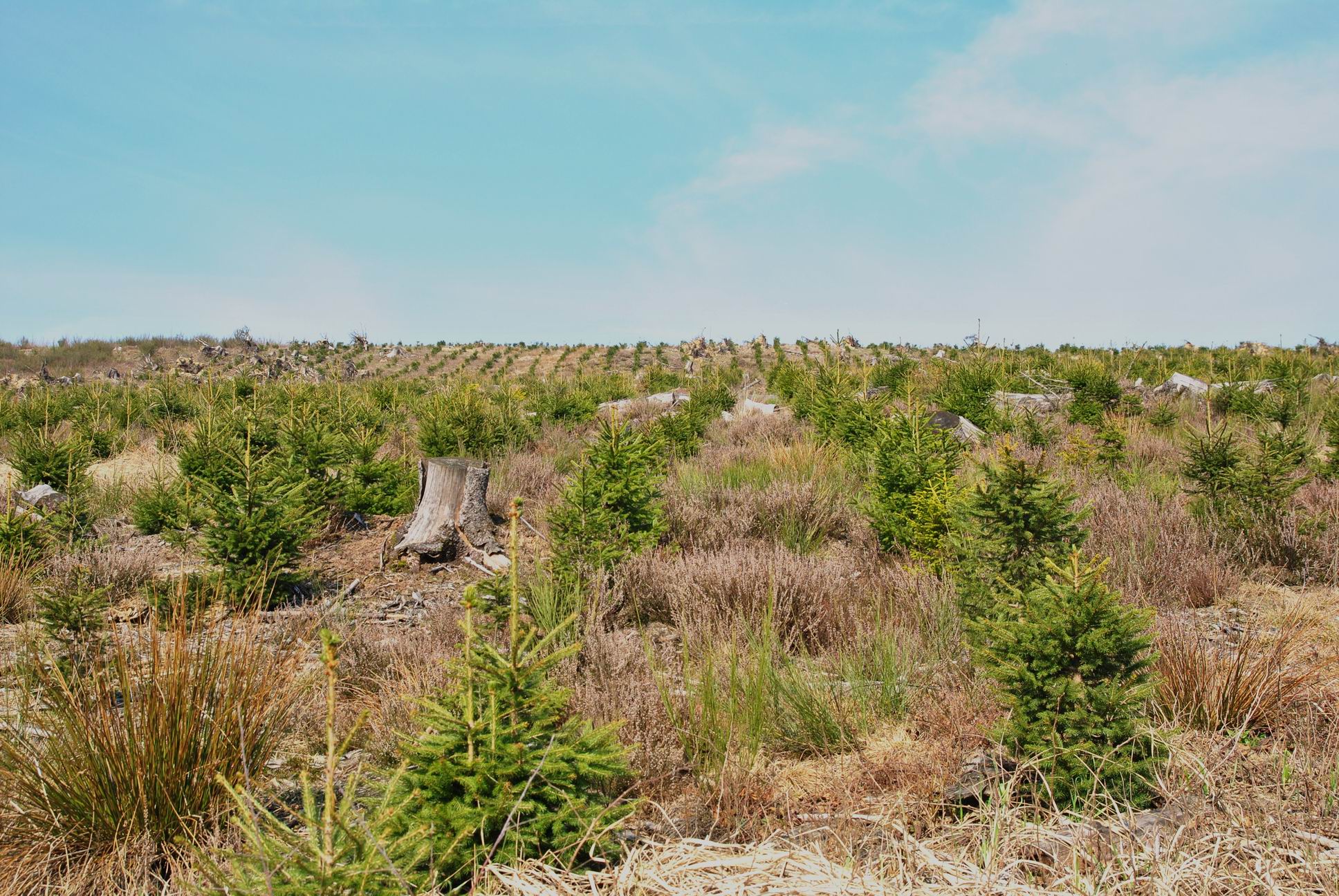 Wieder geht es zurück zur Weggabelung und wir ziehen weiter über gut beschilderte Wanderwege weiter. Überall treffen wir auf aufgeforstete Tannenschonungen, die zeigen, das Stürme hier einst starke Schäden hinterliessen. Vor allem Kyrill hat am Steinberg wenig stehen lassen.