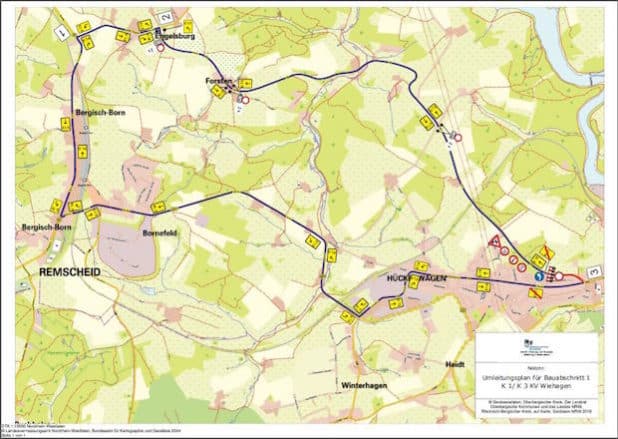 In der 1. Bauphase wird die abzweigende Straße in Fahrtrichtung Remscheid (K1) für etwa sechs bis acht Wochen gesperrt. Eine großräumige Umleitung durch Bergisch Born ist ausgeschildert. So können in dieser Bauphase der halbe Kreisverkehr, die Bushaltestelle in der Wiehagener Straße und die entsprechenden abzweigenden Straßen halbseitig umgebaut werden. Der Verkehr aus der August-Lütgenau-Straße, der Wiehagener Straße und der Blumenstraße kommend wird über eine Baustellenampel geregelt.